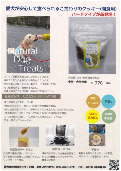 開発にあたって注目したのは、年間70万トンもの廃棄が問題となっている「生おから」です。これに広島県産の天然ひじき、無農薬耕作地のはちみつといった安心・安全な素材を組み合わせ、ワンちゃんの健康を考えたヘルシーなおやつを完成させました。